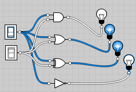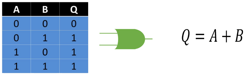 En el Algebra de Boole esta es una suma. Esta compuerta permite que con cualquiera de sus entradas que este en estado binario 1, su salida pasara a un estado 1 también. No es necesario que todas sus entradas estén accionadas para conseguir un estado 1 a la salida pero tampoco causa algún inconveniente. Para lograr un estado 0 a la salida, todas sus entradas deben estar en el mismo valor de 0. Se puede interpretar como dos interruptores en paralelo, que sin importar cual se accione, será posible el paso de la corriente.