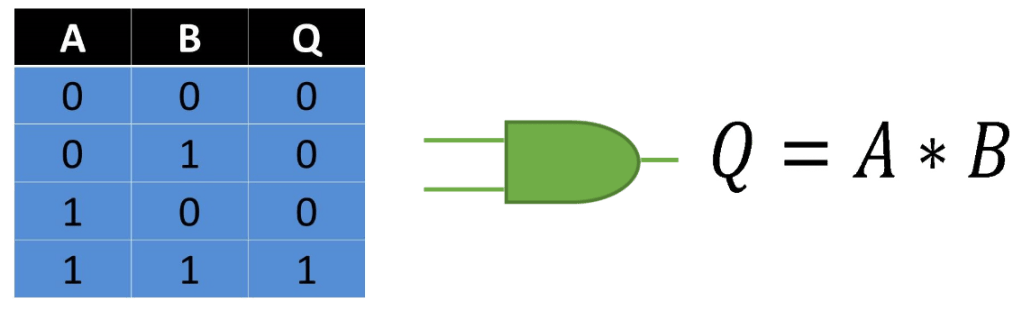 Esta compuerta es representada por una multiplicación en el Algebra de Boole. Indica que es necesario que en todas sus entradas se tenga un estado binario 1 para que la salida otorgue un 1 binario. En caso contrario de que falte alguna de sus entradas con este estado o no tenga si quiera una accionada, la salida no podrá cambiar de estado y permanecerá en 0. Esta puede ser simbolizada por dos o más interruptores en serie de los cuales todos deben estar activos para que esta permita el flujo de la corriente.